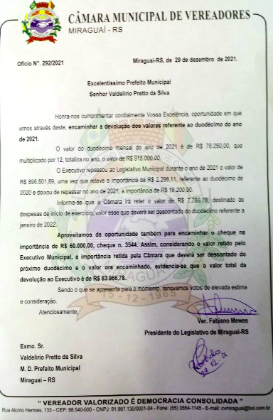 A Câmara Municipal de Vereadores Miraguaí realizou nesta quarta-feira, 29/12, a devolução de recursos dos valores referente ao duodécimo do ano de 2021.